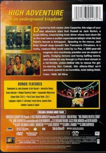 After a card game, Jack Burton takes his friend, Wang Chi (Dennis Dun), to the airport to pick up Wang’s fiancee, Miao Yin (Suzee Pai), but the Lords of Death snatch her and steal Jack’s eighteen wheeler, The Pork Chop Express. Evil 2000-year-old Chinese sorcerer, David Lo Pan (James Hong) plans to marry Miao Yin, a green eyed beauty, and then sacrifice her in order to overcome an ancient curse. To save the girl and his truck, Jack heads for Chinatown with Wang, and beautiful lawyer Gracie Law (Kim Cattrell). Unfortunately for Gracie, she also is beautiful and green-eyed, so Lo Pan decides to marry and kill her instead of Miao Yin. Also, unfortunately for Gracie, Jack is a fake John Wayne: he talks a good game and sounds like the Duke but literally knocks himself out. Rival Chinese gangs take sides, and three evil demi-gods show up as the fight goes underground, in a dark and dank supernatural world beneath Chinatown. Jack and Wang are helped by loopy magician Egg Shen (Victor Wong), Margo (Kate Burton), and Eddie Lee (Donald Li) as kung fu warriors, female ninjas, and unearthly creatures battle.