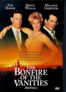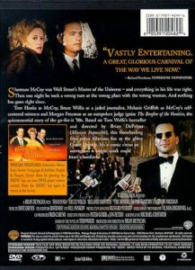 Film adaptation of the Tom Wolfe novel of the same name. Sherman McCoy (Tom Hanks) is a Wall Street millionaire who enjoys the good life and the favors of his gold-digger mistress Maria Ruskin (Melanie Griffith). One night, as the two are driving back to Maria's apartment, Maria makes a wrong turn and the two find themselves in the South Bronx. Maria sees a black youth approaching Sherman's car and guns the engine, running over the teenager and killing him. They drive away and decide not to report the accident. Meanwhile, journalist Peter Fallow (Bruce Willis), anxious for a sensational story, comes upon the youth's death as a rallying point for the local black community. Local district attorney Abe Weiss (F. Murray Abraham) uses the press coverage of the case against Sherman as a way to elevate his own mayoral candidacy. As Sherman is excoriated by the public, the New York community erupts into different factions, all of whom use the case to suit their own purposes. Finally, Sherman is left without any allies to support him except for the sympathetic Judge Leonard White (Morgan Freeman) and the remorseful Fallow.